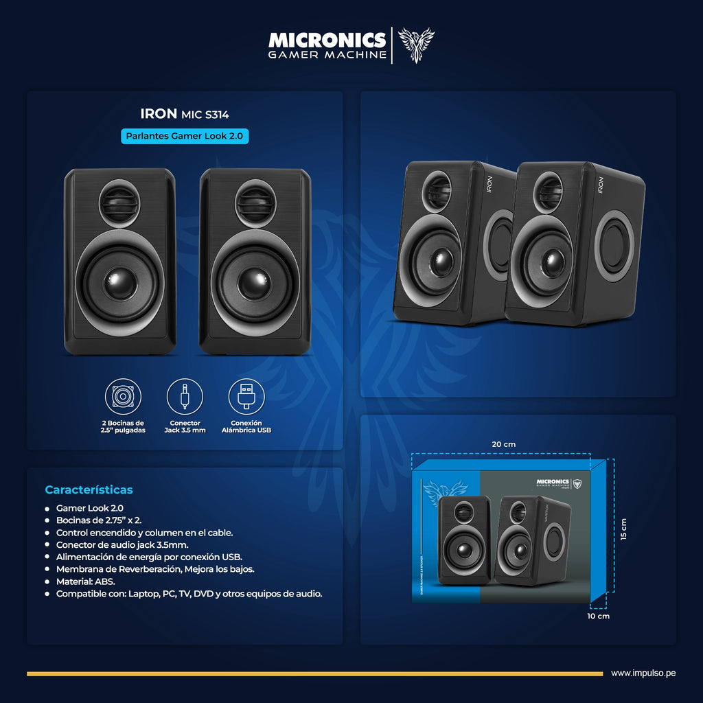 PARLANTE 2.0 MICRONICS IRON MIC S314B | 3.5MM | USB | RGB | NEGRO